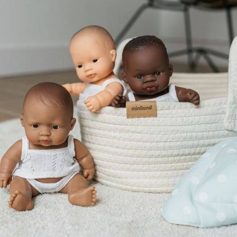Kosz dla lalek Mojżesza z uchwytami, idealnie sprawdzi się podczas zabawy z lalkami Miniland o wielkości do 40 cm.