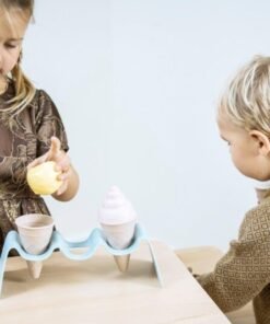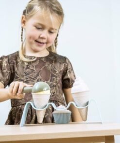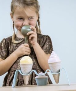 BIO zestaw do lodów, podobnie jak inne zestawy BIO,utrzymany jest w modnych pastelowych kolorach. W zestawie tym znajdują się wafelki, lody, babeczki muffiny łyżka do lodów i stojak na lody. Można bawić się lodziarnię, cukiernie – pomysłów jest wiele!