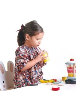 Wspaniała zabawa w serwowanie wymyślnych napojów smoothie! Pokrój drewnianym nożykiem truskawkę, jabłko, banana i pomarańczę. Umieść owoce w blenderze i miksuj! Przelej do kubeczka ze słomką… Nie zapomnij o kostkach lodu!