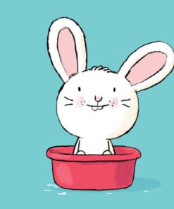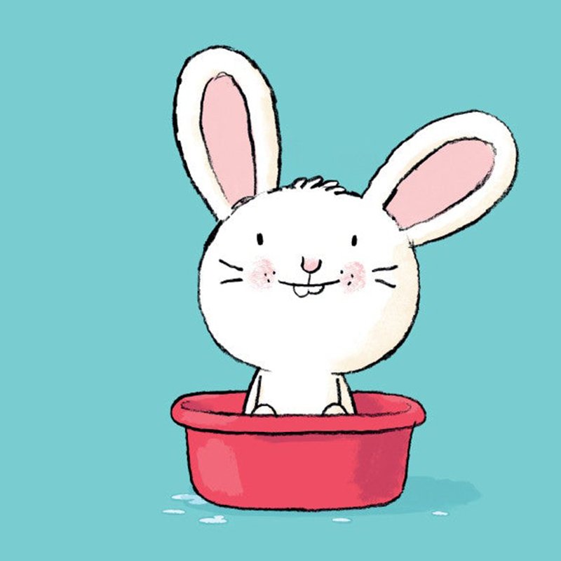 Zawołaj króliczka do wanienki. Umyj mu głowę. Tylko uważaj, żeby woda nie dostała mu się do oczu! Opłucz go i wytrzyj. Wysusz mu futerko suszarką, posmaruj buzię kremem. Gotowe. Jaki czyściutki!