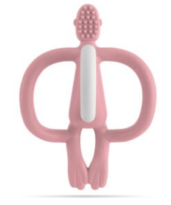 Z tyłu główki, małpka posiada miękką silikonową szczoteczkę do masowania dziąseł i ząbków, na którą możemy nałożyć żel kojący lub pastę. Wspaniale nadaje się do nauki mycia ząbków jako pierwsza szczoteczka. Wesoły kształt małpki 3D zachęci każdego Malucha do zabawy.