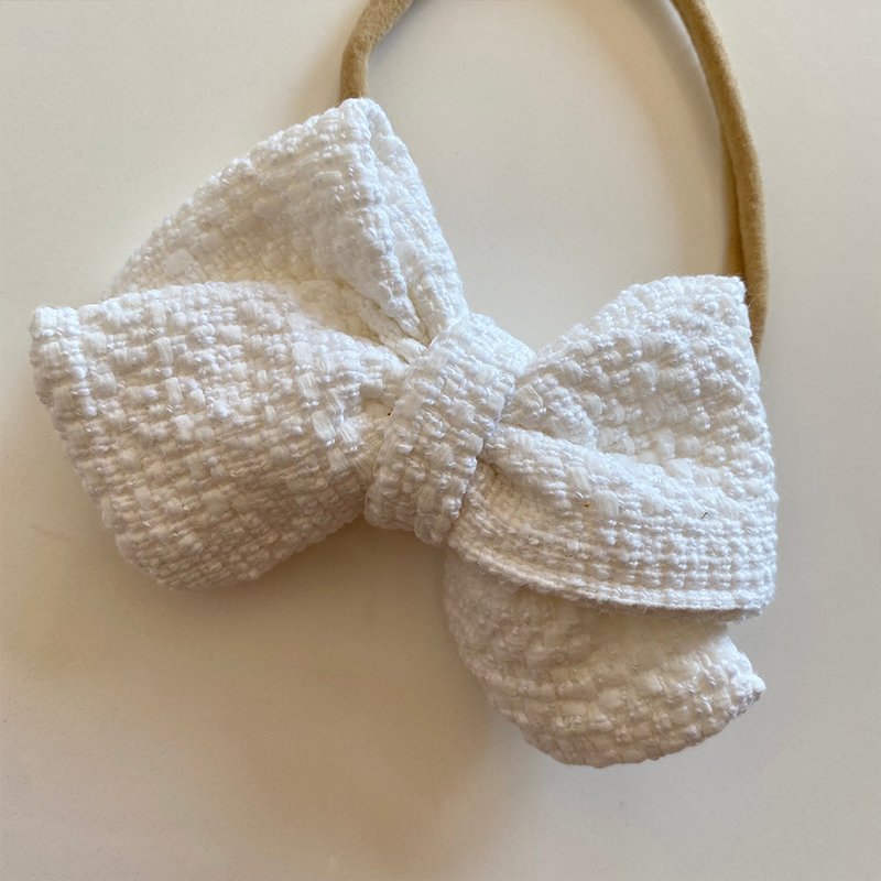 Tradycyjna kokardka wykonana z elastycznej wełnianej dzianiny. W pięknym kremowym kolorze.
