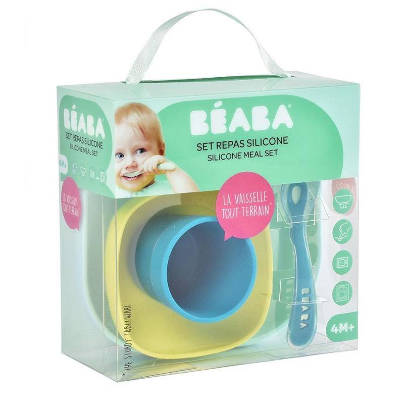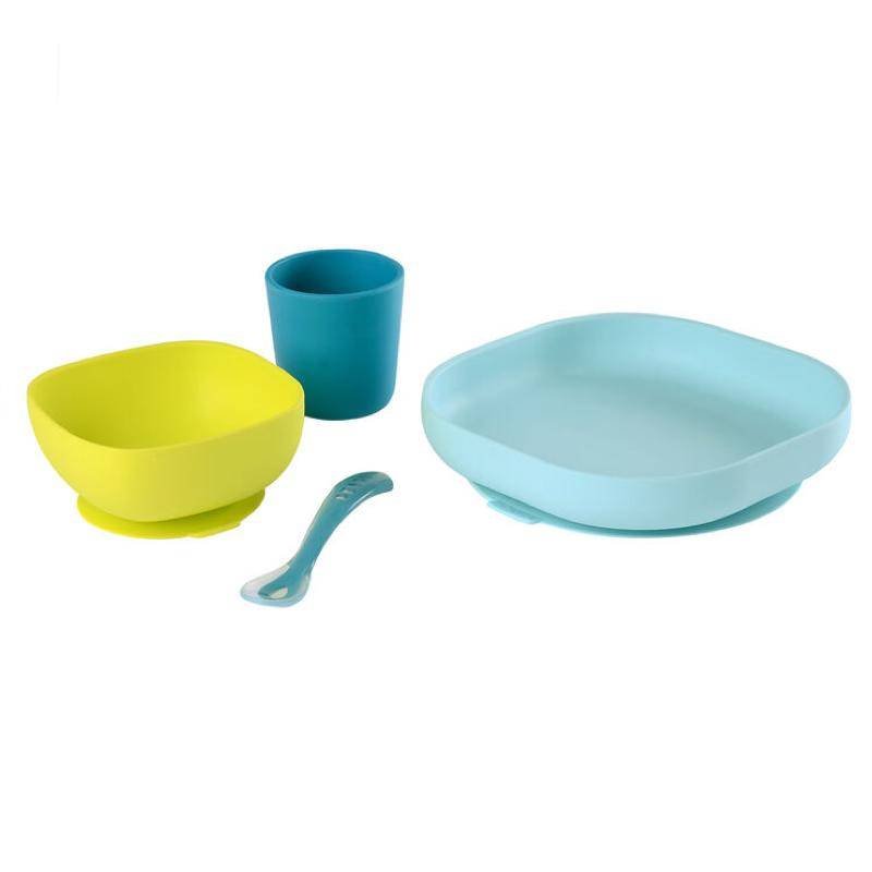 Komplet naczyń z silikonu francuskiej marki BEABA składa się z talerzyka, miseczki, kubka i łyżeczki treningowej. Wszystkie elementy zestawu charakteryzuje ergonomiczny, zaokrąglony kształt i miękkie, gładkie brzegi. Wyższe boki miseczki i talerzyka ułatwiają dziecku samodzielne nabieranie posiłku na widelec czy łyżkę. Naczynia mają na spodzie antypoślizgową przyssawkę, dzięki czemu są stabilne i dobrze trzymają się stołu. Kubeczek jest poręczny i wygodny do nauki picia, a łyżeczka idealnie pasuje do dziecięcej buzi. Łyżeczka posiada specjalną wypustkę, dzięki której można ją odłożyć tak, by jej główka nie dotykała powierzchni, dzięki czemu jej używanie jest o wiele bardziej higieniczne.