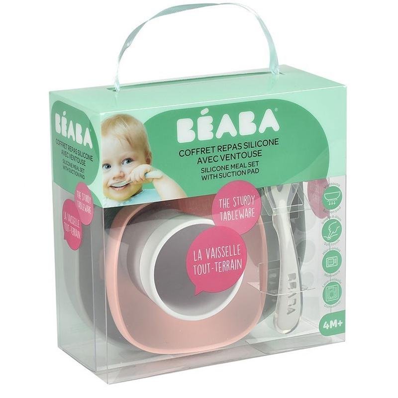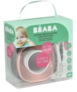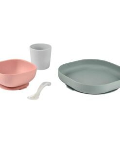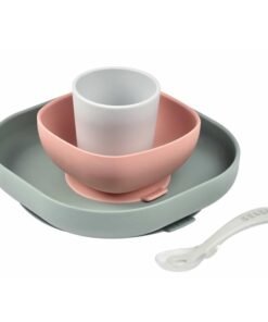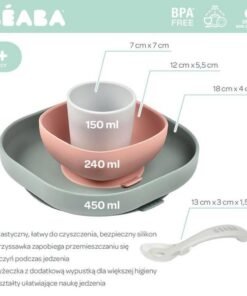 Komplet naczyń z silikonu francuskiej marki BEABA składa się z talerzyka, miseczki, kubka i łyżeczki treningowej. Wszystkie elementy zestawu charakteryzuje ergonomiczny, zaokrąglony kształt i miękkie, gładkie brzegi. Wyższe boki miseczki i talerzyka ułatwiają dziecku samodzielne nabieranie posiłku na widelec czy łyżkę. Naczynia mają na spodzie antypoślizgową przyssawkę, dzięki czemu są stabilne i dobrze trzymają się stołu. Kubeczek jest poręczny i wygodny do nauki picia, a łyżeczka idealnie pasuje do dziecięcej buzi. Łyżeczka posiada specjalną wypustkę, dzięki której można ją odłożyć tak, by jej główka nie dotykała powierzchni, dzięki czemu jej używanie jest o wiele bardziej higieniczne.