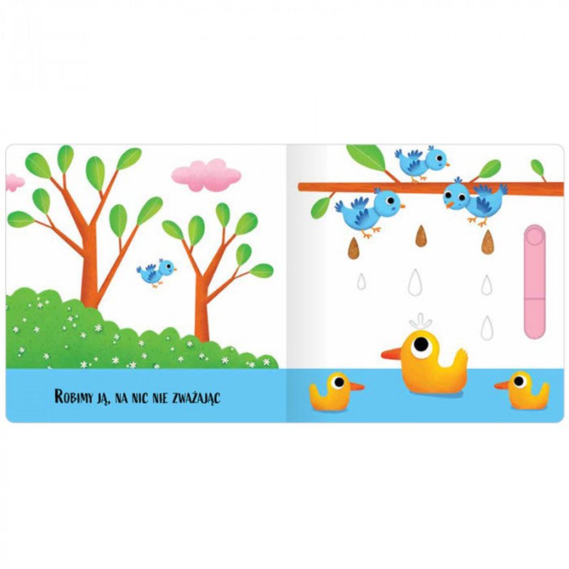 Uwagę dziecka przyciągają nie tylko ilustracje, ale także liczne ruchome elementy, które zapewniają wspaniałą, pełną niespodzianek zabawę rozwijającą wiele umiejętności. Maluch może manipulować, przekręcać, otwierać okienka i przesuwać elementy.