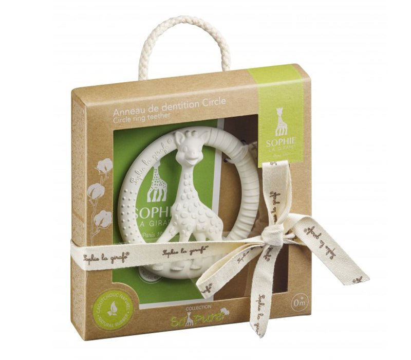 Kauczukowy gryzaczek żyrafa Sophie So’Pure w pięknym, ekologicznym pudełku, przewiązanym bawełnianą kokardką, ze sznurkowym uchwytem to śliczny drobiazg na prezent z okazji narodzin dziecka.