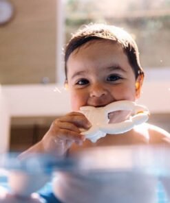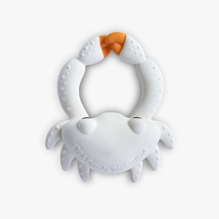 Krab Sharon został ręcznie wykonany z naturalnego miękkiego kauczuku, który idealnie nadaje się do żucia w okresie ząbkowania. Jego różne faktury pomagają stymulować zmysły dziecka. Krab nie ma dziurki, która sprzyjałaby rozwojowi bakterii wewnątrz zabawki, a mimo to unosi się na wodzie. Zapewnia zrównoważoną dla środowiska i bezpieczną dla dziecka zabawę.