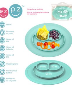 Mini Mat amerykańskiej marki EZPZ (czyt. izipizi) to nieduża, poręczna podkładka i trójdzielny talerzyk w jednym, stworzony z najbezpieczniejszego silikonu. Pasuje do większości blatów krzesełek do karmienia. Dzięki zamykanemu opakowaniu, jest to idealne rozwiązanie na podróż.