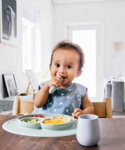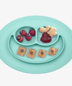 Innowacyjna silikonowa podkładka mocno przywiera do stołu czy innej gładkiej powierzchni, na której ją położysz. Dzięki temu małe dziecko nie jest w stanie jej przesunąć czy zrzucić. Ma owalny kształt, estetyczny wygląd i ładny, pastelowy kolor. Trójdzielny talerz pozwala dzielić posiłki na porcje, co ułatwia malcowi naukę samodzielnego jedzenia, a z czasem także – rozpoznawanie kategorii pokarmów. Dodatkowo, pomaga rodzicowi podawać dania, złożone z odpowiedniej ilości różnego rodzaju składników. Pojemność talerzyka jest idealna na początkowe posiłki: 2 razy 60 ml i 120 ml. Radosny wygląd – dwie mniejsze przegródki przypominają kształtem oczy, a większa uśmiech – sprawia, że posiłki pozytywnie się maluchom kojarzą. Nadaje się do serwowania zarówno zimnych, jak i ciepłych potraw. Niewielkie rozmiary Mini Mat sprawiają, że doskonale sprawdza się na spacerze, w podróży czy w restauracji, mieści się też w większości standardowych torebek. Do maty dołączone jest ponadto opakowanie, dzięki któremu przenoszenie jej w torebce jest całkowicie higieniczne.