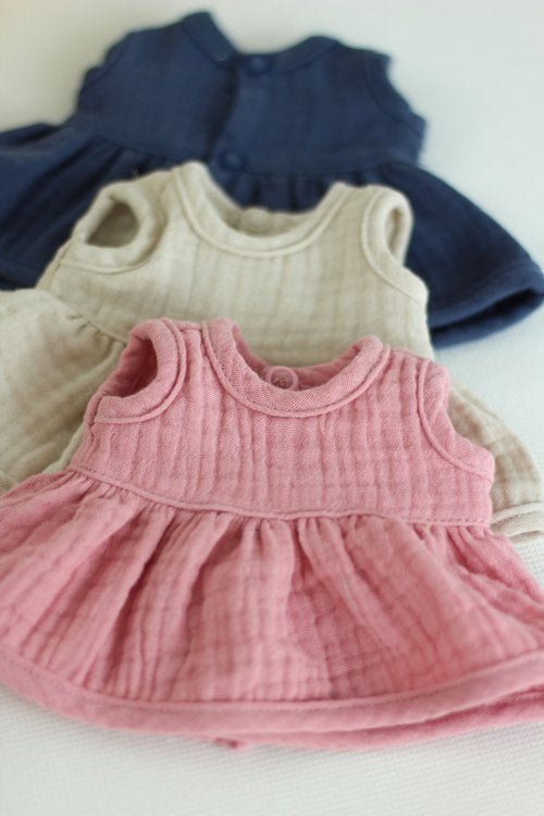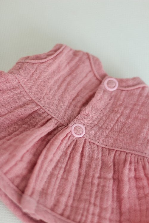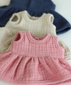 Ręcznie uszyta sukienka z delikatnego muślinu bawełnianego typu double gauze. Ubranko posiada rozcięcie z tyłu na całej długości i zapinane jest na bezpieczne napy. Maluszek ubierając swoją laleczkę będzie dzielnie trenować małą motorykę.