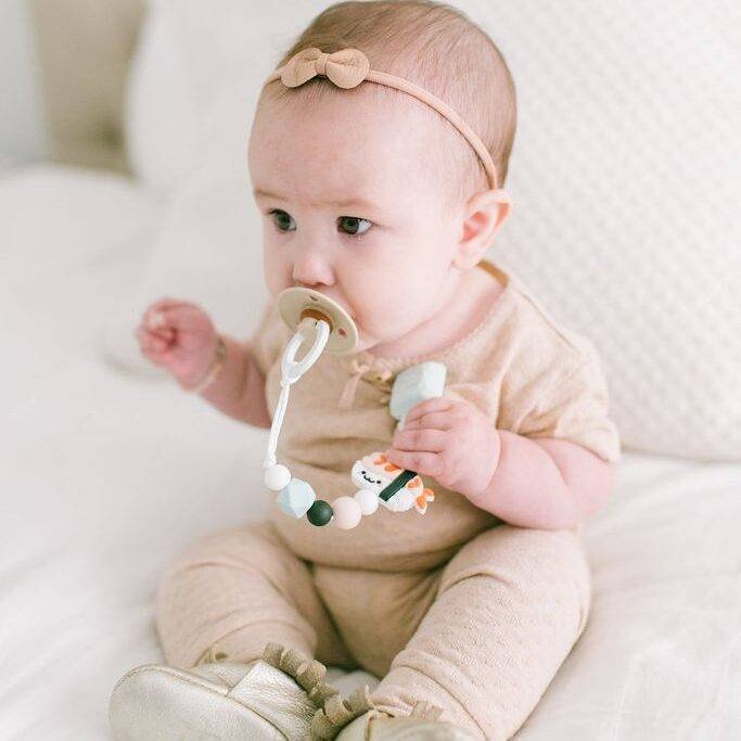 Nowoczesna zawieszka DARLING z klipsem z silikonu spożywczego oraz mini gryzakiem.