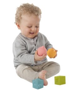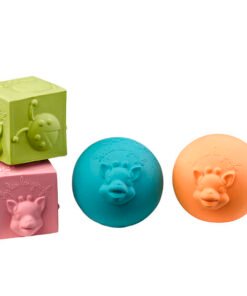 Bajecznie kolorowe, lekkie, kauczukowe piłki i kostki stworzone po to by rozwijać zręczność małych rączek maluszka.Maluch może doskonalić swoje umiejętności motoryczne poprzez manipulowanie piłkami i kostkami w trakcie zabawy rzucając je, chwytając, ściskając, układając na sobie lub turlając.