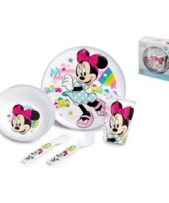 Zestaw naczyń do jedzenia dla dziecka z uwielbianą przez dzieci Myszką Minnie. Zestaw składa się z talerzyka, miseczki, kubeczka, łyżeczki i widelca. Wykonany został z melaminy. Jest bardzo wytrzymały i lekki. Naczynia są bezpieczne dla środowiska i nie zawierają szkodliwych substancji BPA. Można je myć w zmywarce. Są odporne na niskie i wysokie temperatury.